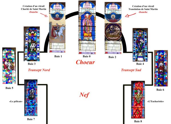 L’objectif est d’harmoniser le chœur avec une trilogie de Saint Martin, deux nouveaux vitraux encadreront l’unique vitrail d’époque, représentant Saint Martin évêque de Tours, resté intact après les bombardements de juin 1940. La Charité de Saint Martin à gauche et La translation de Saint Martin à droite.